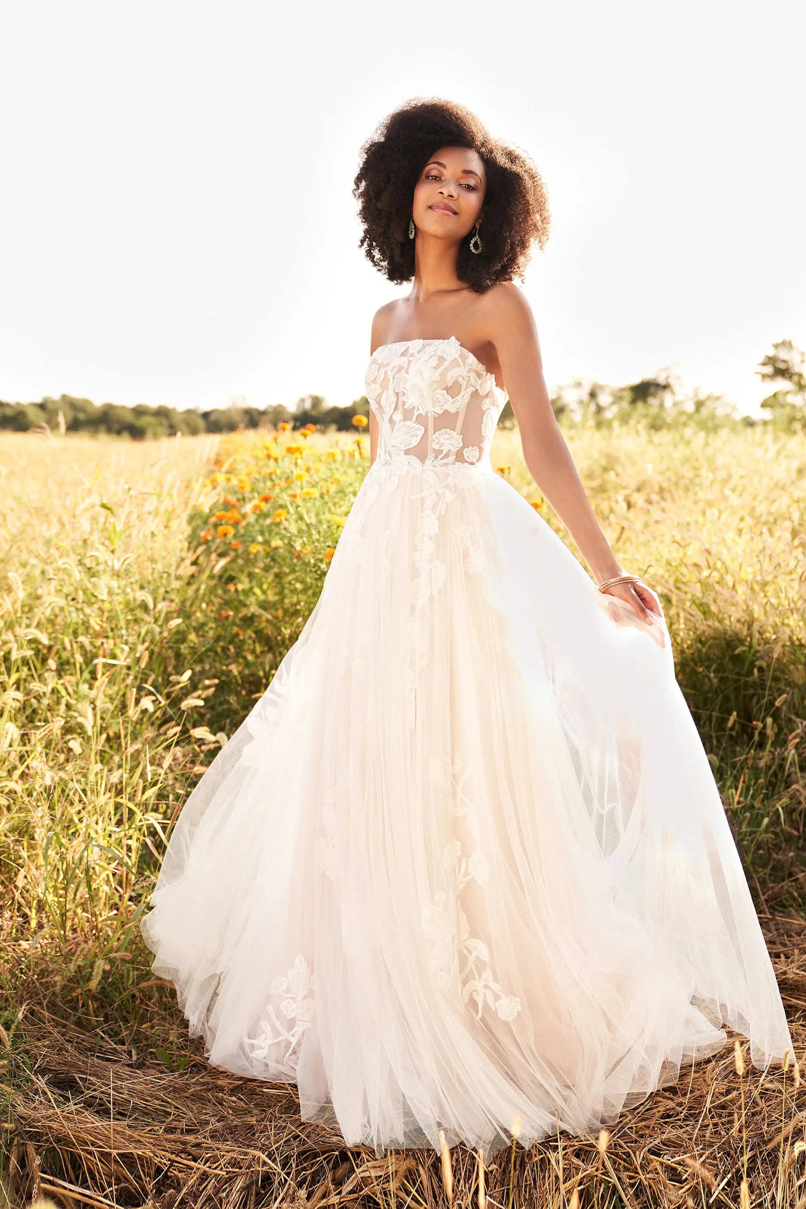 Designed by Lillian West, this breathtaking A-line bridal gown features a strapless, semi-sheer bodice with exposed corset boning, a frothy, pleated tulle skirt, and botanical lace appliqués floating throughout.