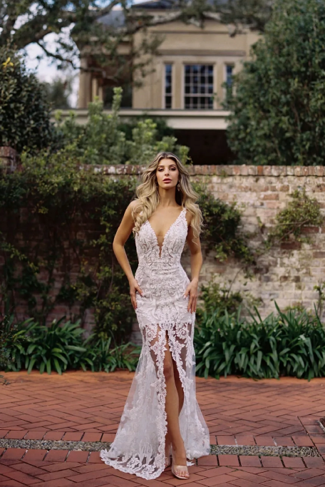 This flirty wedding dress by Wilderly Bride blends tradition with the unexpected. A plunging V-neckline, an illusion mesh open back, and a solid upper body pair with a split, transparent skirt, creating a perfectly boho, breezy look.