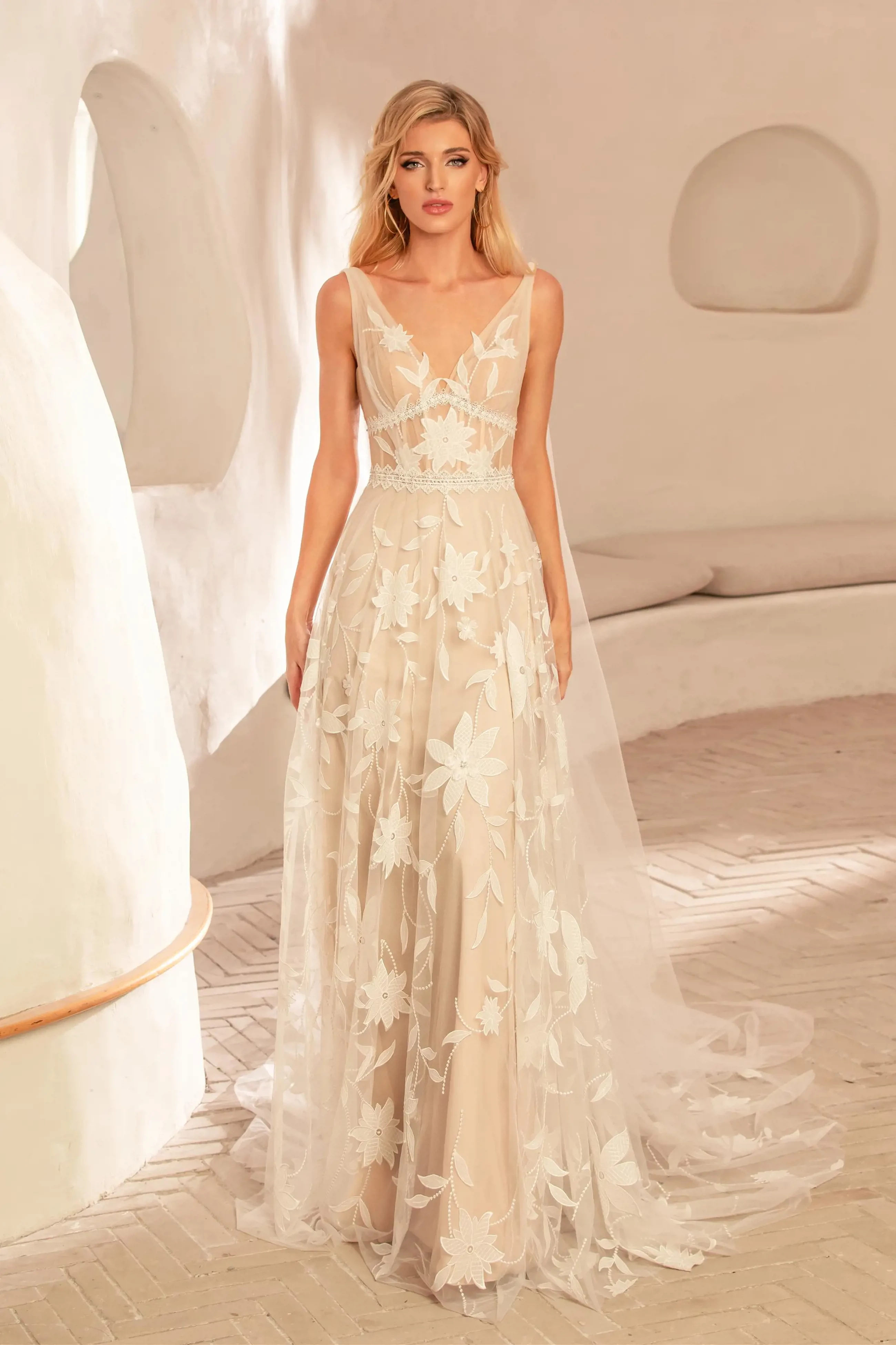 Coral is an A-line wedding dress by Chic Nostalgia with a V-neckline, a semi-sheer bodice, and oversized florals sprinkled throughout a fluttering tulle base. Draped fabrics and taupe tones create a natural, effortlessly beautiful look.