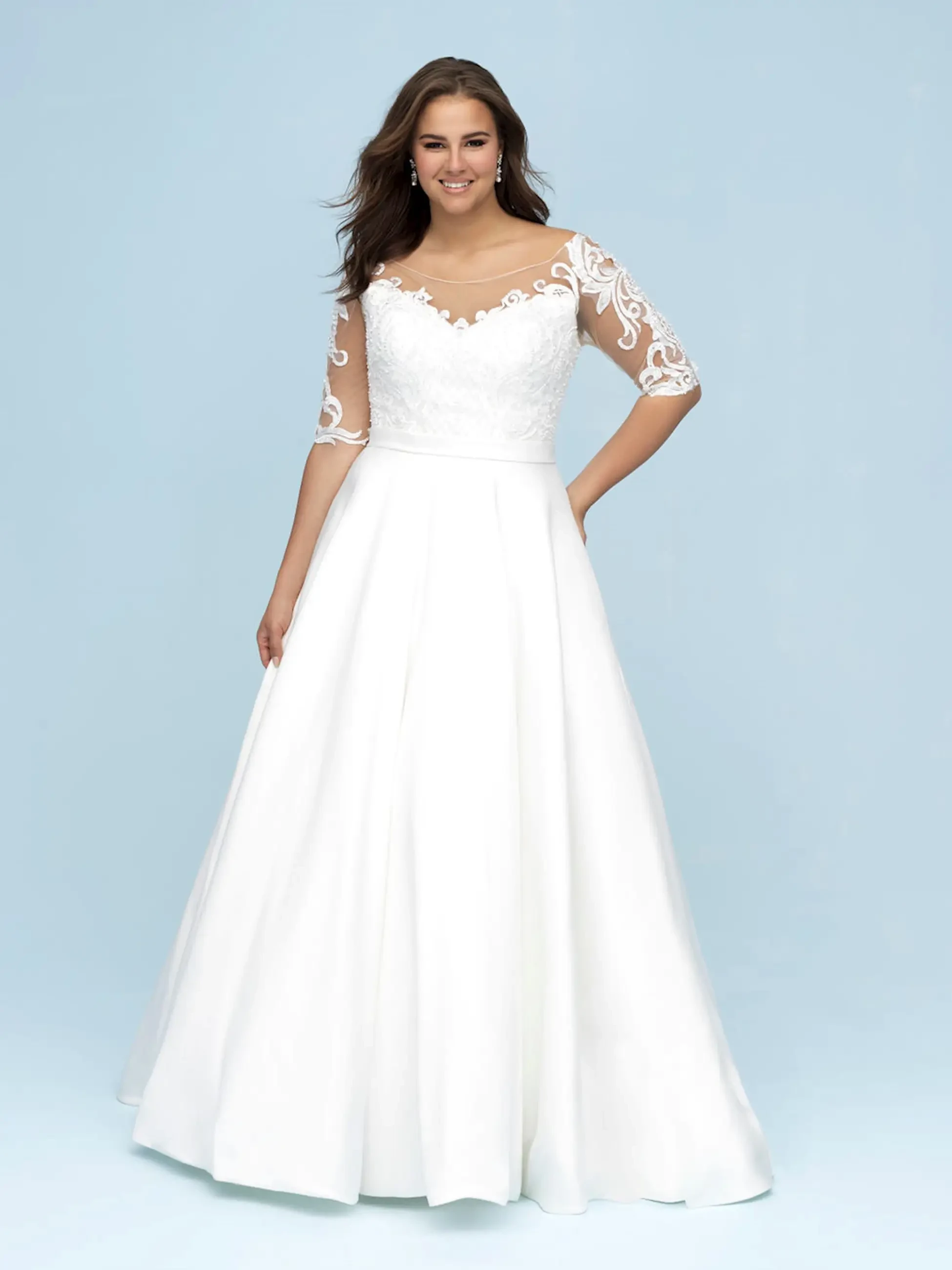 We love gowns like this that feature illusion lace sleeves for a peek of skin while maintaining some coverage!